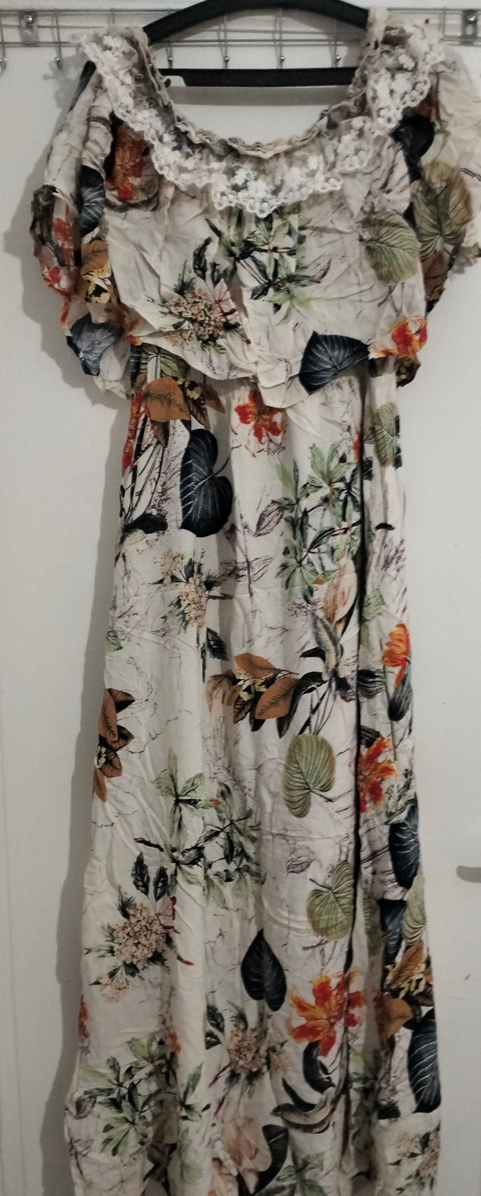 A long maxi dress featuring an off-the-shoulder neckline, a floral print, and a ruffled bodice overlay.