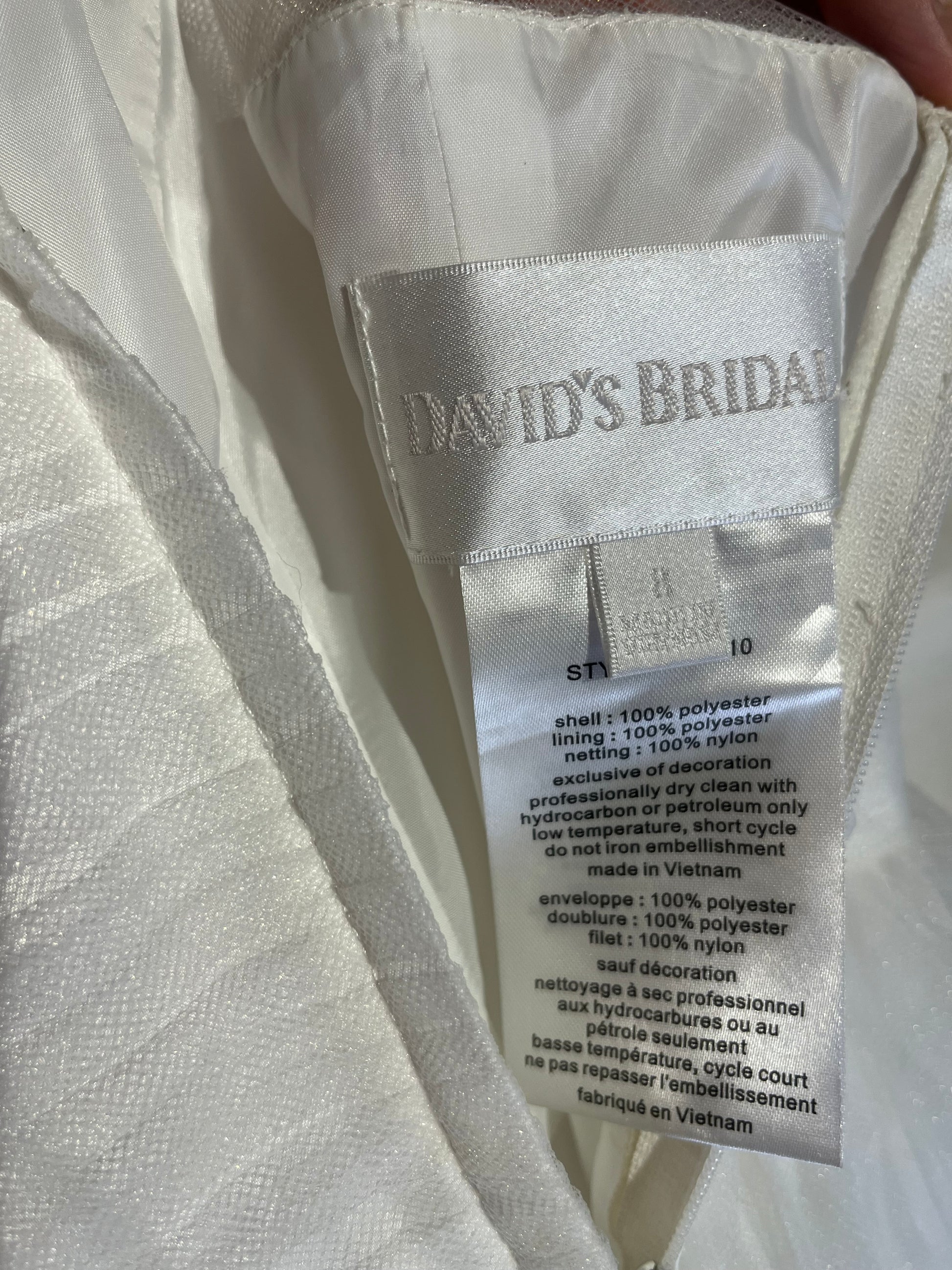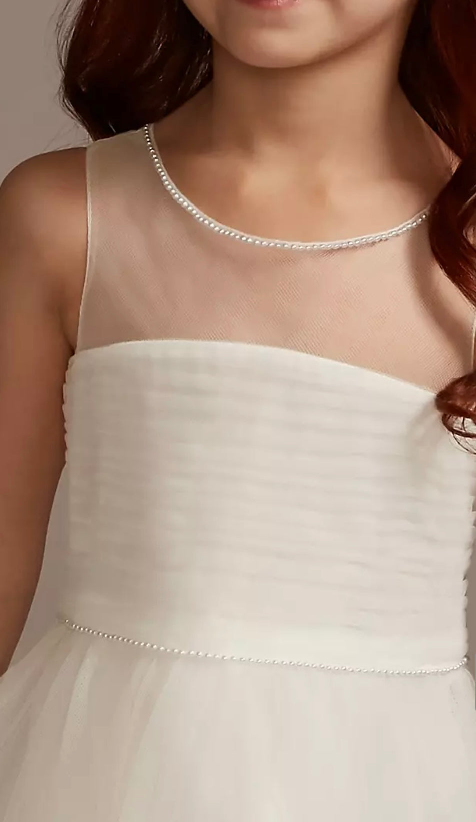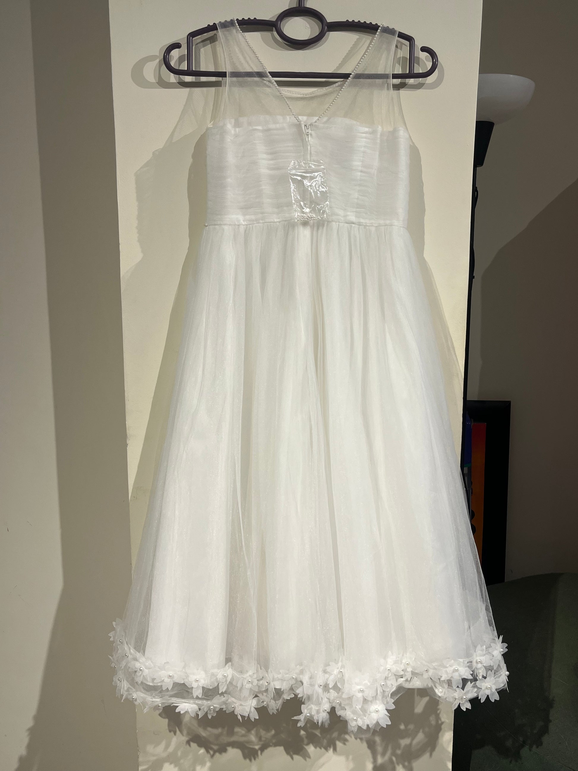 Original David’s Bridal Flower Girl Dress – Pearl Details & 3D Floral Hem (Size 8, Brand New with Tag).