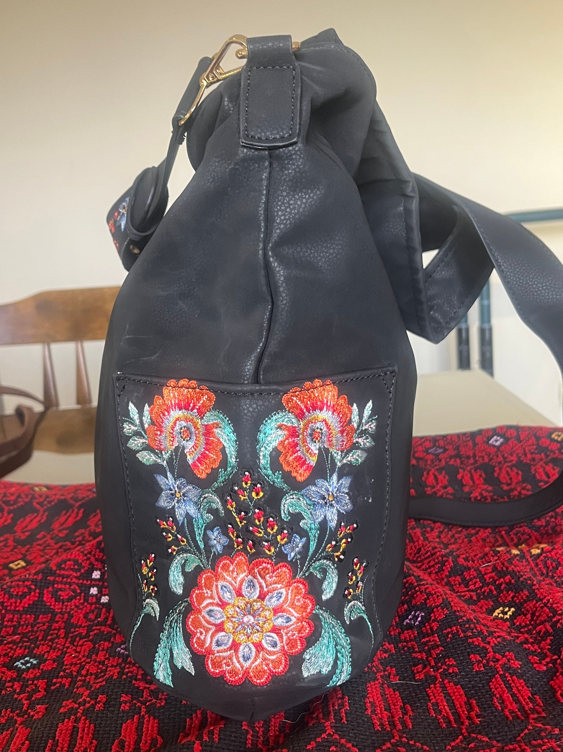 Original Desigual Black Bucket Bag with Colorful Side Embroidery