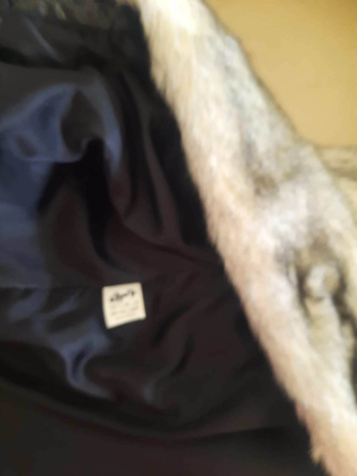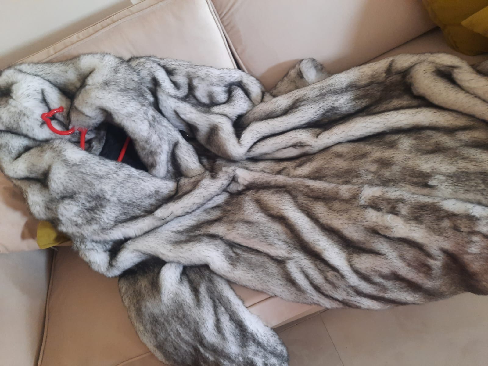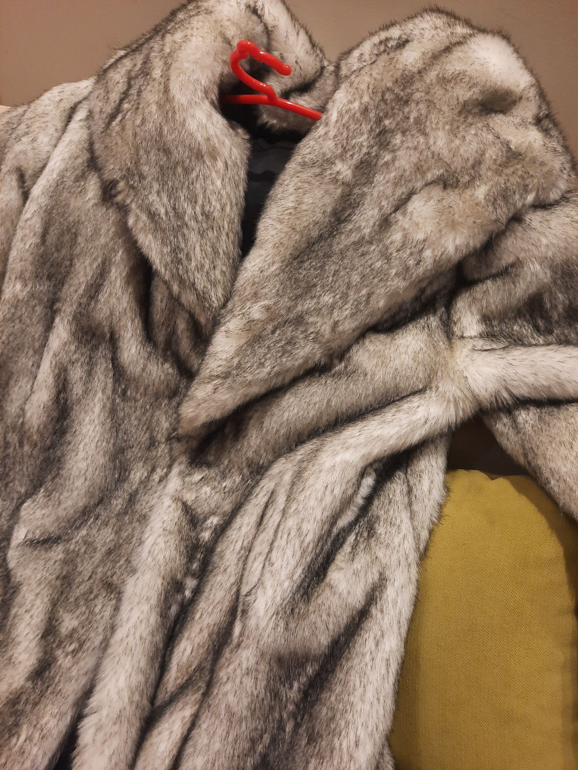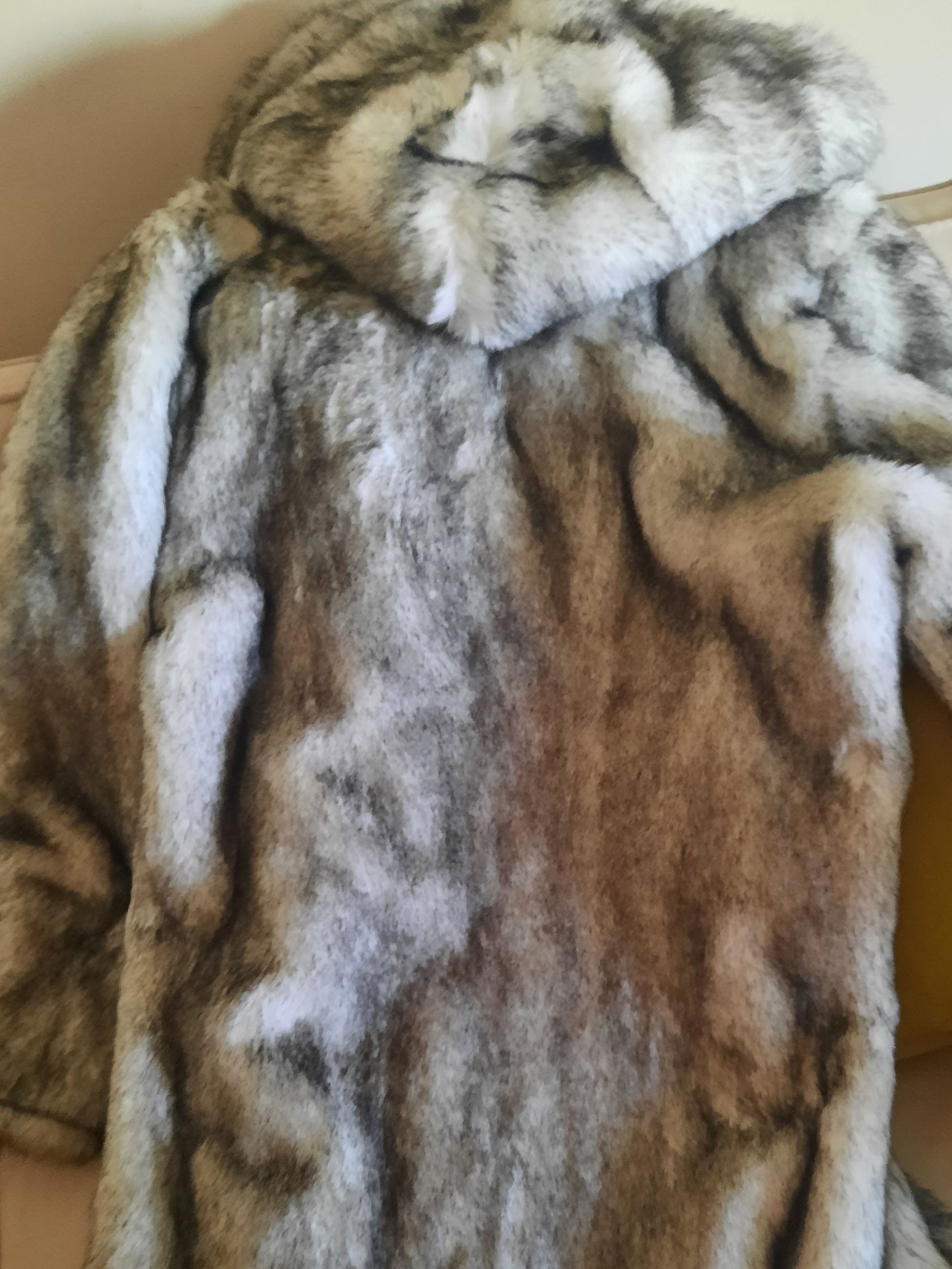 Elegant long offwhite with a black touch fur coat.