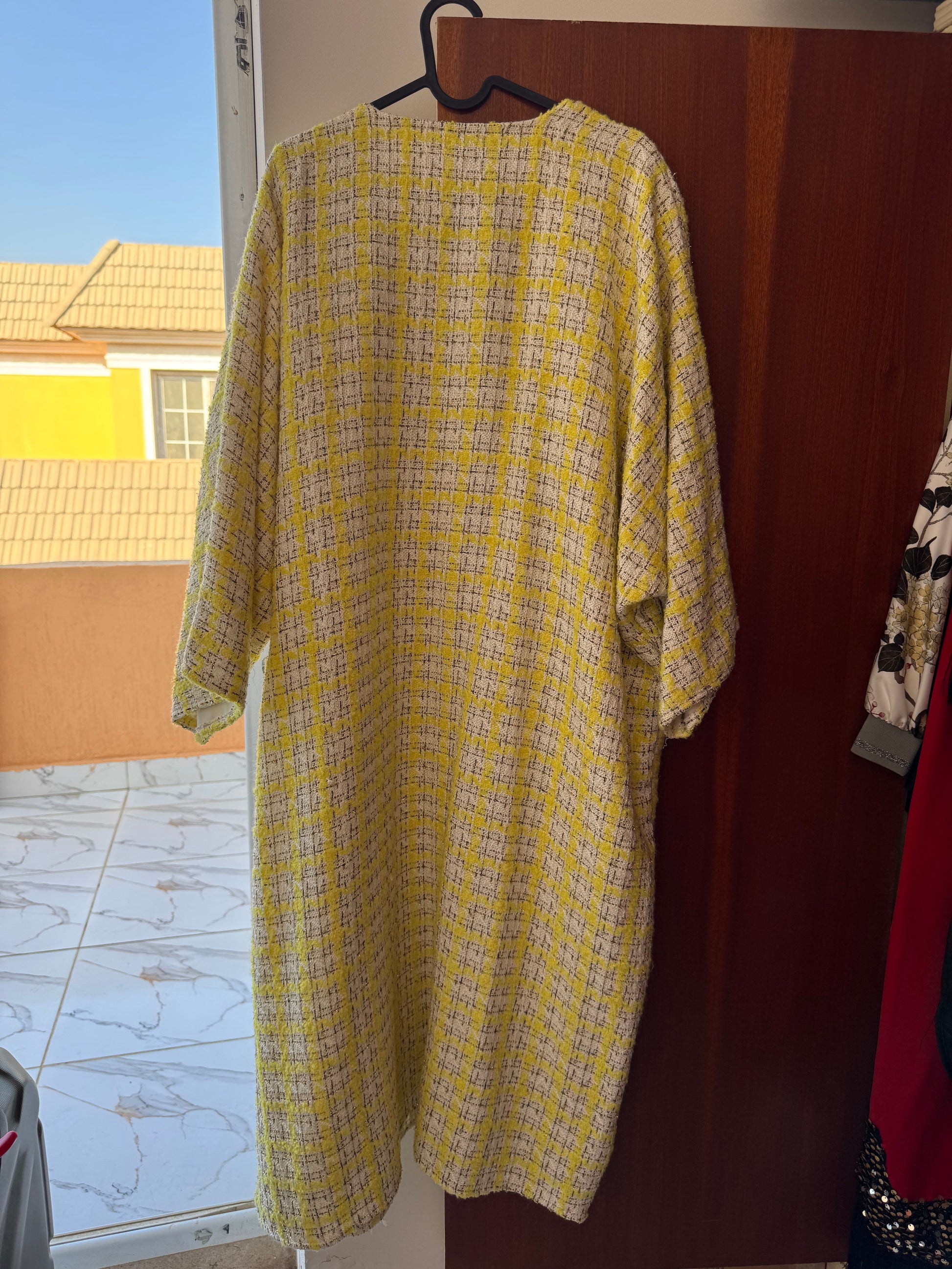 Tailored Salem Fabric, yellow and white tweed long coat.