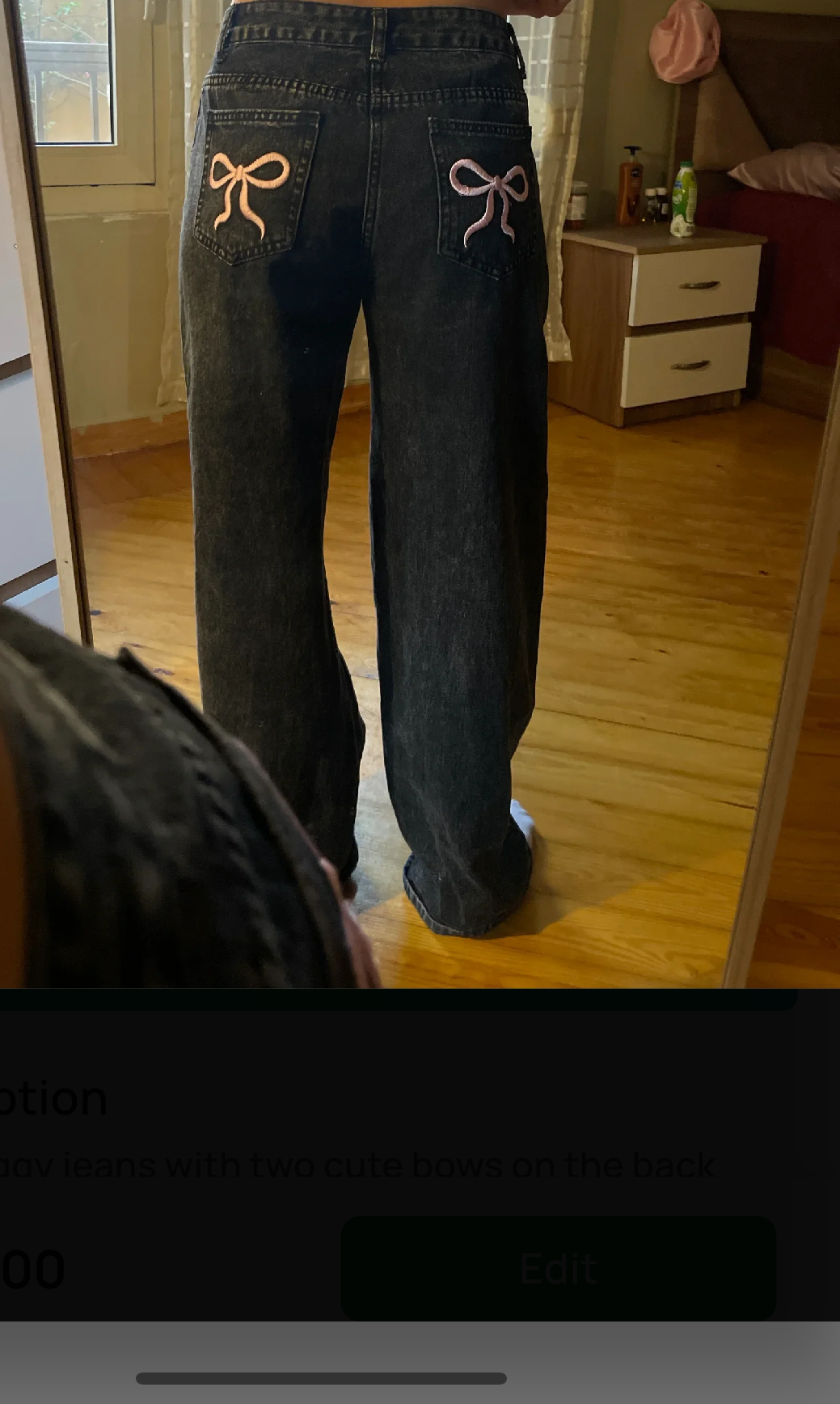 Original SHEIN Black Baggy Jeans, size 34, featuring cute bows on the back pockets. These jeans offer a trendy, relaxed fit with a touch of elegance, perfect for casual wear.
